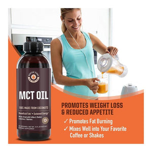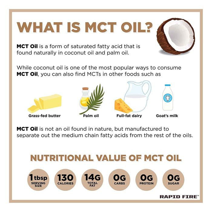 Pure MCT Oil; 100% sourced from coconuts Supports metabolism and increased fat burning Shown to enhance energy levels and stamina Contains vital C6, C8, C10 & C12 fatty acids Mixes